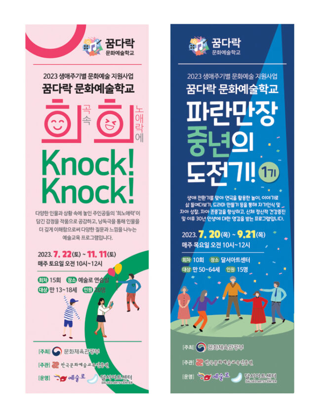 문화체육관광부 주최하고, 한국문화예술교육진흥원 주관하는 ‘2023 생애주기별 문화예술교육 지원사업 꿈다락 문화예술학교’에 대구 공연 및 교육 전문 예술단체인 예술로가 선정되어 2개의 교육프로그램을 운영한다. 이번 프로그램은 예술로와 달서아트센터가 협약을 맺고 달서구와 남구 각각의 장소에서 7월부터 12월까지 진행되며 생애전환 문화예술학교 <파란만장 중년의 도전기!>는 중장년층, <희희 Knock! Knock! >은 청소년을 대상으로 하는 프로그램이다. <희희Knock!Knock!>은 다양한 인물과 상황 속에 놓인 주인공들의…