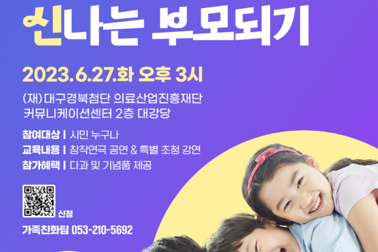 2023년 6월 27일 화요일 오후 3시, 양성평등 부모교육 특별 강연회 <자녀와 통하는 신나는 부모되기> 프로그램이 대구경북첨단 의료산업진흥재단 커뮤니케이션센터…